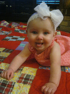 Carley is now 14 lb. 9.5 oz. (25%) and 26 1/2 in. (75%). I think both girls are going to be taller than me!! Dr. Richardson had Carley practice sitting and standing with little assistance. She did great and just when the doctor went to lay Carley back down she spit up all over us and then smiled!